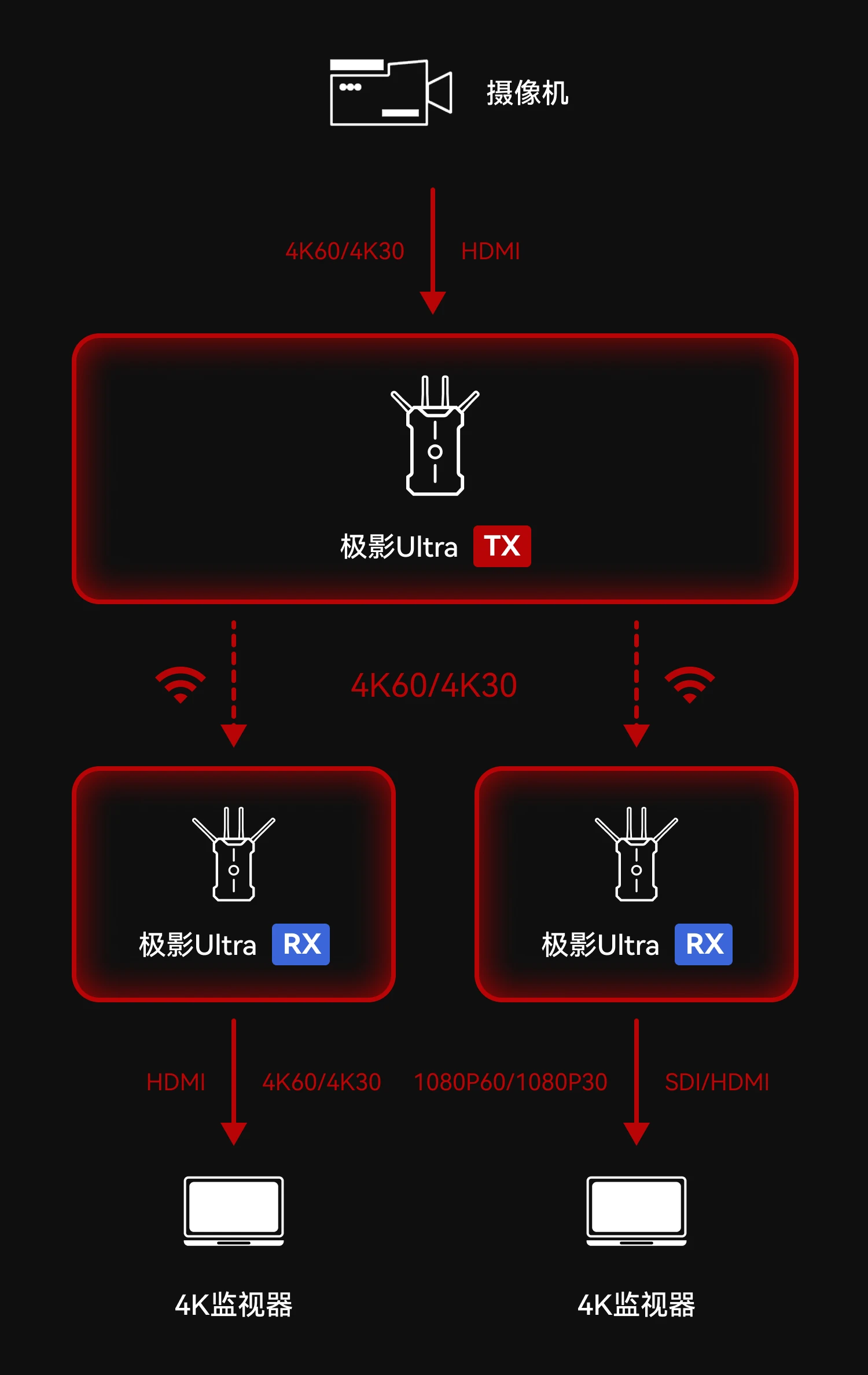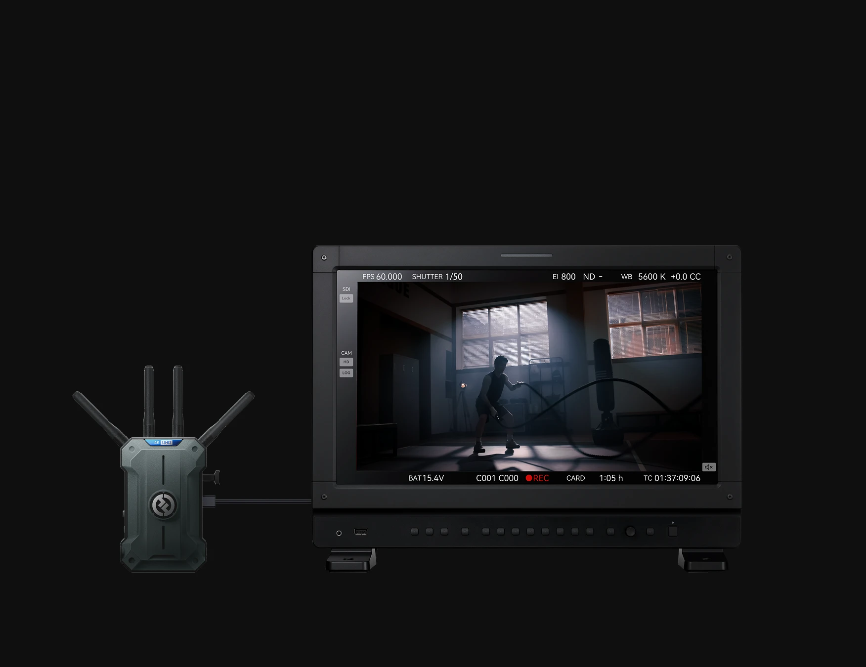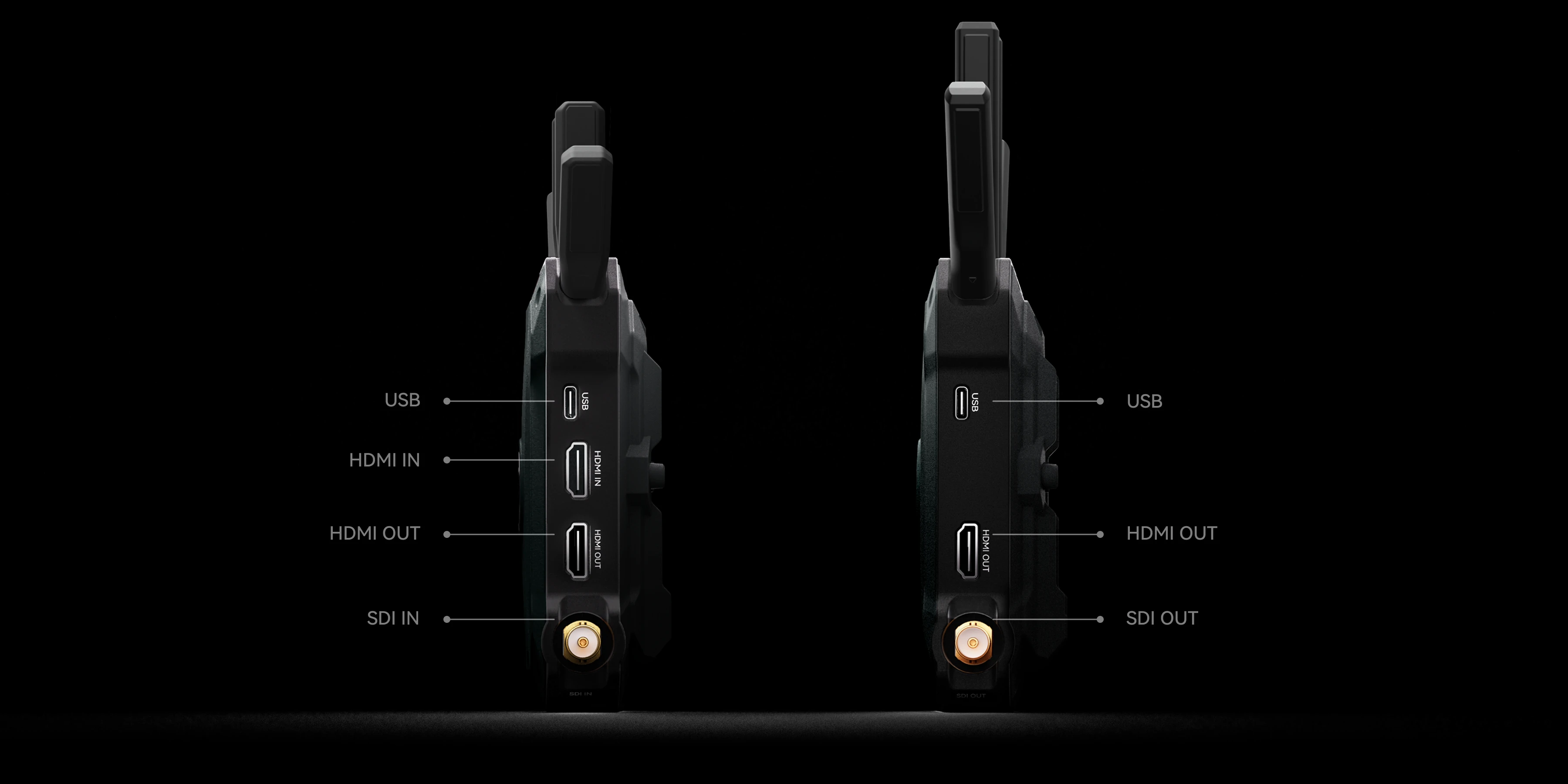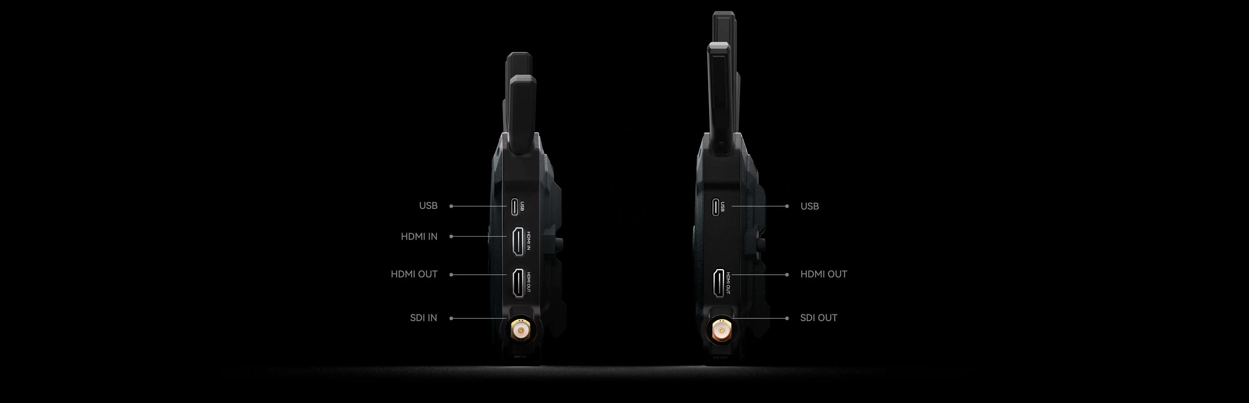 兼具 HDMI 与 SDI 输入/输出接口,全面适配从微单、电影机到广播级设备的不同视频源。发射端支持