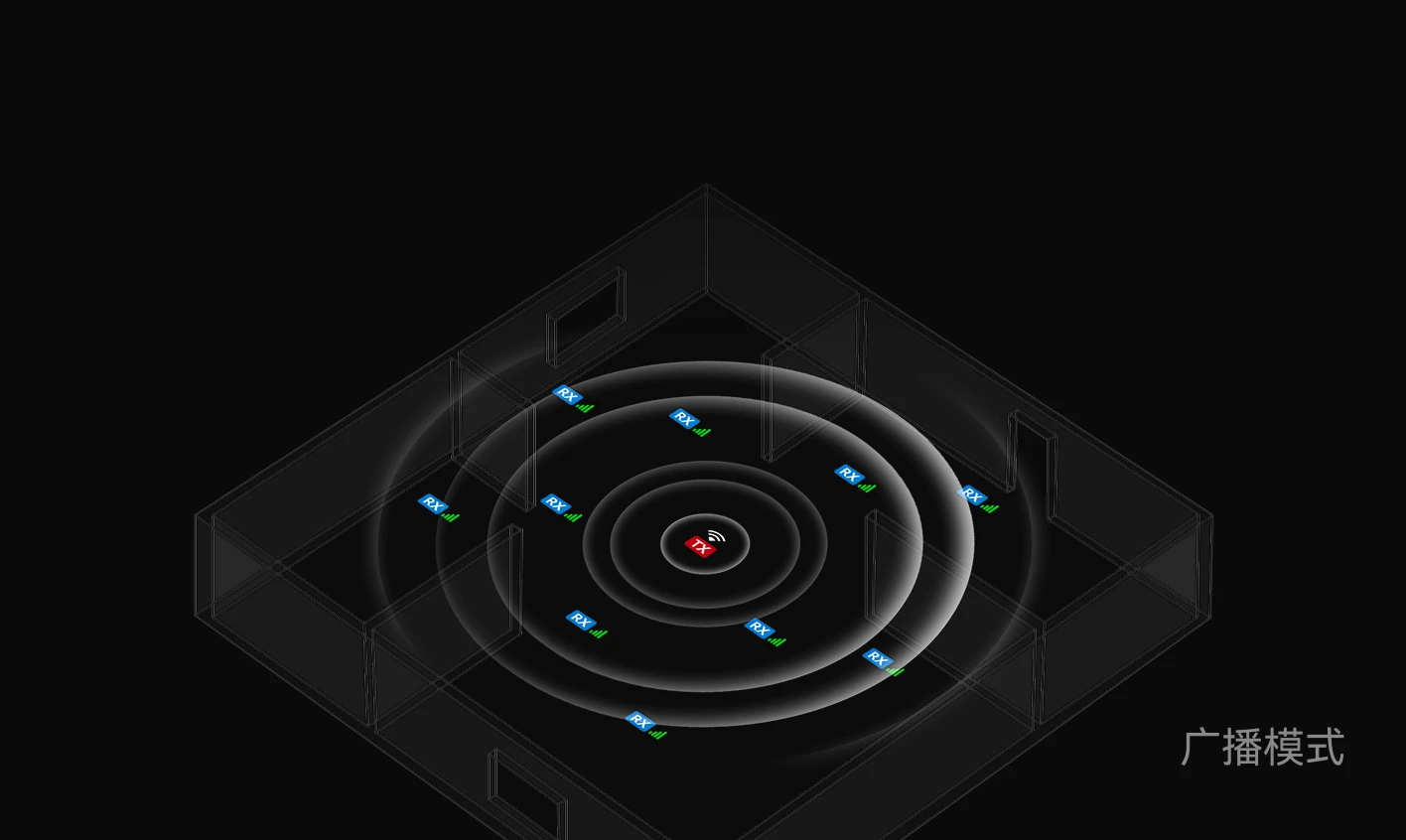 支持广播模式,单个发射端可同时连接多达 20 个接收端,理论支持无限连接,实现真正的“一发多收,无限